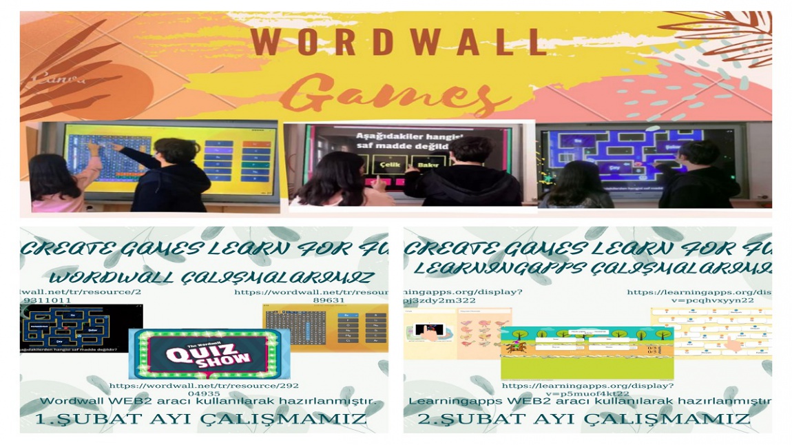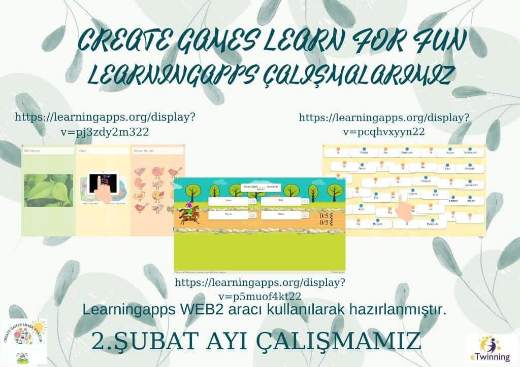 Create Games Learn For Fun "Oyunlar Yarat, Eğlenerek Öğren" e-twinning projesinde öğretmenimiz Kader Sağlam eşliğinde 2 öğrencimiz Şubat ayı için Wordwall ve Learningapps web2 araçlarını kullanarak oyunlar hazırladılar. Oyunları oynarken çok eğlendiler.