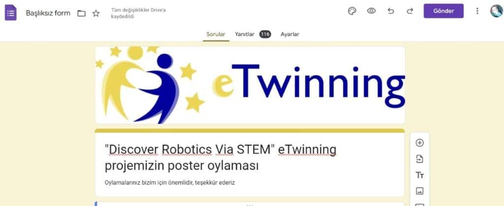 eTwinning projemiz için okulumuz 7.sınıf öğrencileri Canva programını kullanarak afiş hazırladılar. Afişler Google formlar ile oylandı. Oylamaya Şahidi Ortaokulu öğrenci ve öğretmenleri katıldı. 116 kişinin katıldığı oylamada 1.olan afiş %33.6 ile Begüm öğrencimizin hazırladığı afiş oldu. Kendisini tebrik ediyoruz.