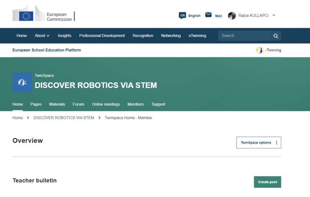 Discover Robotics Via STEM ismi ile başlattığımız eTwinning projemiz sanal olarak Erasmus projemizi destekleyecektir. eTwinning platformu, KA220 projemizi takip etmek , yaygınlaştırmak, etkili iletişim ve işbirliğini sağlamak için etkin bir şekilde kullanılacaktır. Bu portal sanal ortamda en büyük destekçimiz olacaktır. eTwinning platformu aynı zamanda ulusötesi LTTA'ları (Öğrenme Öğretme Eğitim Aktiviteleri) desteklemek, sonuçları yaymak ve okullar arasında etkili etkileşim sağlamak için kullanılacaktır. Öğretmenler ve öğrenciler bir araya gelecek, web2.0 araçlarını öğrenecek, işbirliği yapacak ve ortak faaliyetler yürütecekler. eTwinning ortamı, diğer okullardaki öğretmenlerin projeyi bilmesini ve yaymasını sağlayacaktır. Aynı zamanda birbirleri ile çalışmalarını da sağlayacaktır. İyi uygulamaların paylaşılması projenin etkisini artıracak ve Avrupa'daki insanlar da sonuçlardan