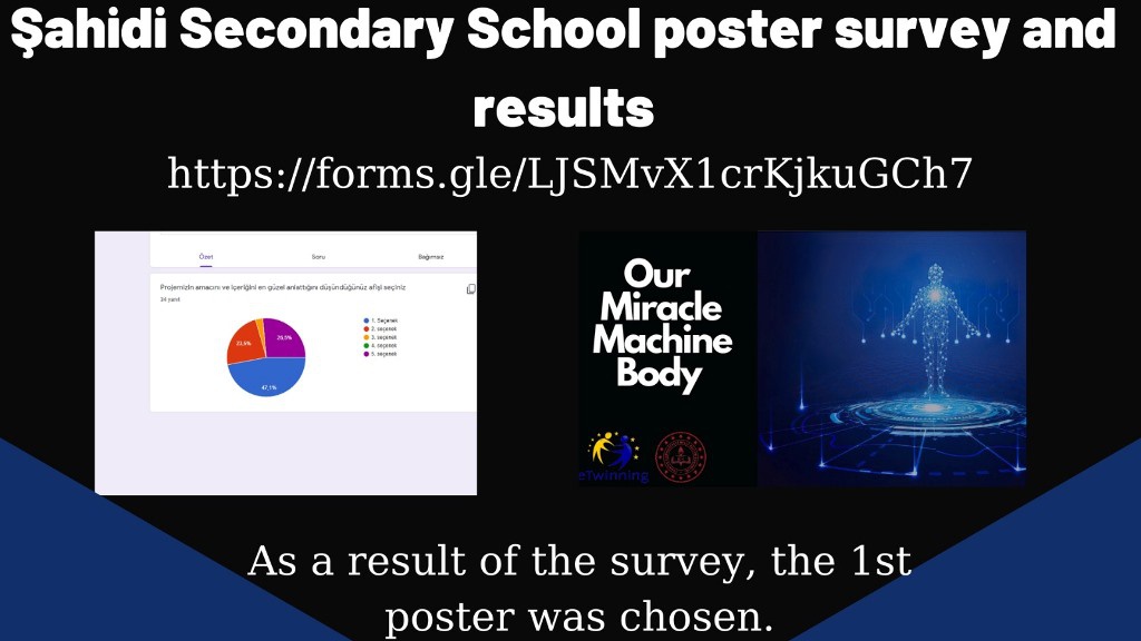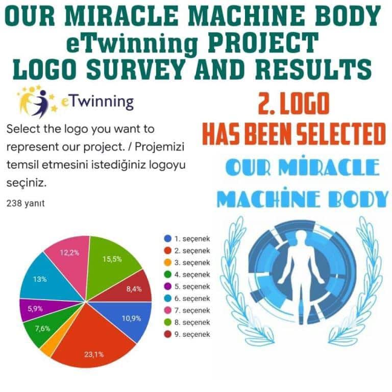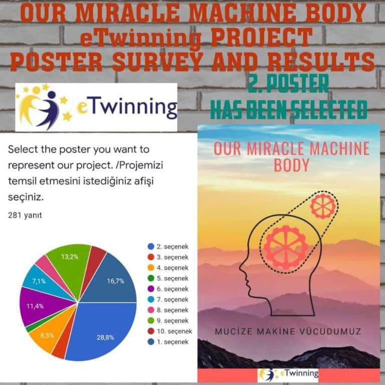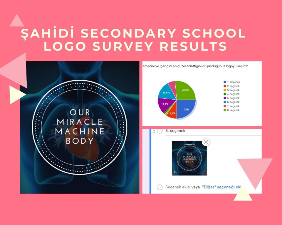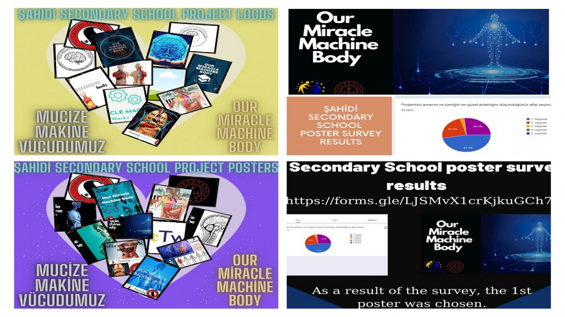 Okulumuz Fen Bilimleri Öğretmeni Rabia KULLAPCI ve Kader SAĞLAM rehberliğinde yürütülen ''MUCİZE MAKİNE VÜCUDUMUZ-OUR MİRACLE MACHİNE BODY ''adlı eTwinning projesinin logo ve afişleri, projede yer alan öğrenciler tarafından tasarlandı. Tasarlanan logo ve afişler, Google form ile anket hazırlanarak, okulumuzun tüm paydaşları (öğretmen, veli, öğrenci ve diğer çalışanlar) tarafından oylandı. Oylamada en yüksek oyu alan Logo ve Afişi tasarlayan Öğrencilerimizi tebrik ediyoruz.