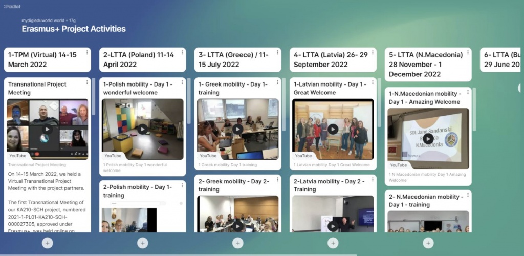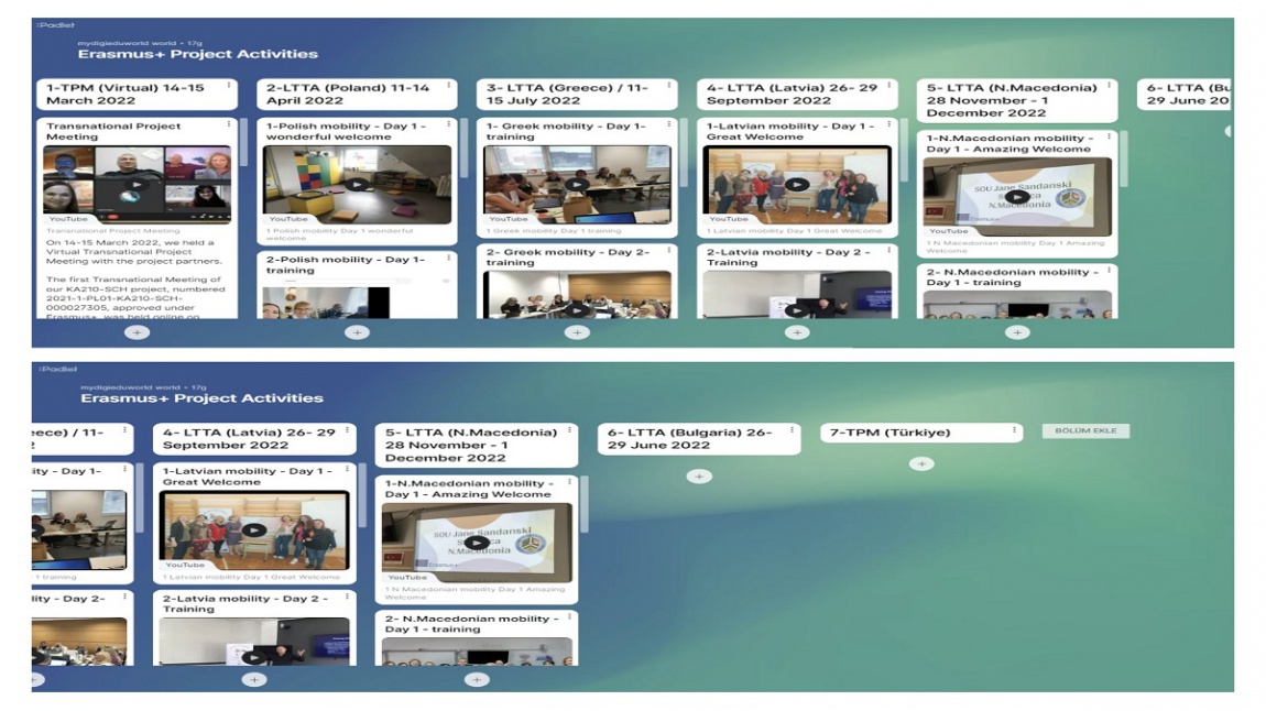 MY DIGI-EDU WORLD projemizin ana faaliyetleri kapsamında; 14-15 Mart 2022 tarihinde sanal proje toplantısı, 11-14 Nisan 2022 tarihleri arasında Polonyada ilk eğitim faaliyeti, 11-15 Temmuz 2022 tarihleri arasında Yunanistan'da ikinci eğitim faaliyeti, 26-29 Eylül 2022 tarihleri arasında Letonya'da üçüncü eğitim faaliyeti, 28 Kasım-1 Aralık 2022 tarihleri arasında Kuzey Makedonya'da dördüncü eğitim faaliyeti gerçekleştirildi.