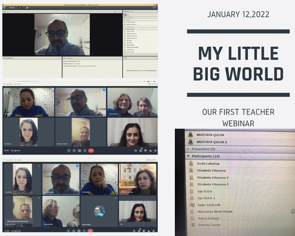 Okulumuz İngilizce Öğretmeni Mustafa ÇULHA'nın kuruculuğunu yaptığı "MY LITTLE BIG WORLD" (BENİM KÜÇÜK BÜYÜK DÜNYAM) isimli eTwinning projesi yine okulumuz öğretmenleri Rabia KULLAPCI, Kader SAĞLAM ve okul Müdür Yardımcımız Eşe SUDA'nın katılımları, ayrıca ortaklık kurulan uluslararası paydaşlarımız Letonya, Makedonya, Polonya ve Romanya ortaklığı ve bu ülkelerden toplam 10 yabancı öğretmenin işbirliği ile başlamış ve ilk uluslararası webinarını 12 Ocak 2022 tarihinde gerçekleştirmiştir.