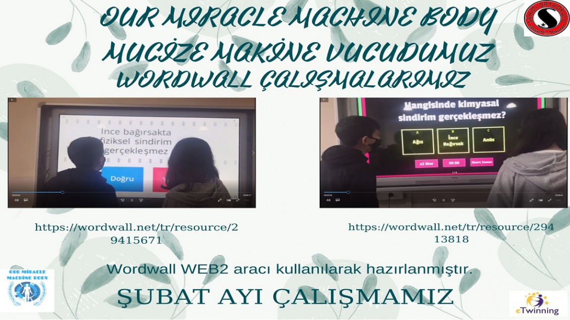 Kader Sağlam ve ekibi Our miracle machine body (Mucize makine vucudumuz) adlı e twining projesinin Şubat ayındaki çalışması olarak Wordwall web2 aracını kullanarak Sindirim konusuyla ilgili Quiz Show ve Doğru-yanlış oyunlarını hazırladılar.Öğrenciler hazırladıkları oyunları kendileri ve arkadaşlarıyla oynayarak hem öğrendiler hemde eğlendiler.
