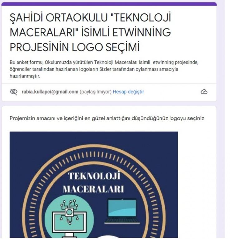 Okulumuz Fen Bilimleri Öğretmeni Rabia KULLAPCI rehberliğinde yürütülen "Teknoloji Maceraları"''adlı eTwinning projesinin logo ve afişleri, projede yer alan öğrenciler tarafından tasarlandı. Projede yer alan 5 öğrencimiz, Web 2.0 Araçlarından Canva ile logolarını tasarladılar. Proje öğrencilerimiz tarafından Google form üzerinden anket hazırlandı. Tasarlanan logolar anket ile oylandı. Oylama sonucu, 5E sınıfından Emine adlı öğrencimizin logosu 1.oldu. Tebrikler Emine.